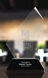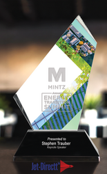 The Exemplar Award showcases a bold, angular design that symbolizes strength, leadership, and forward momentum. Crafted from clear optical crystal, its sharply faceted form rises from a solid black base, creating striking contrast and visual depth. The expansive front face is ideal for deep-etch or full-color personalization, ensuring each piece delivers a powerful, lasting message. Sophisticated and contemporary, the Exemplar Award is a distinguished choice for honoring outstanding performance and exemplary achievement.